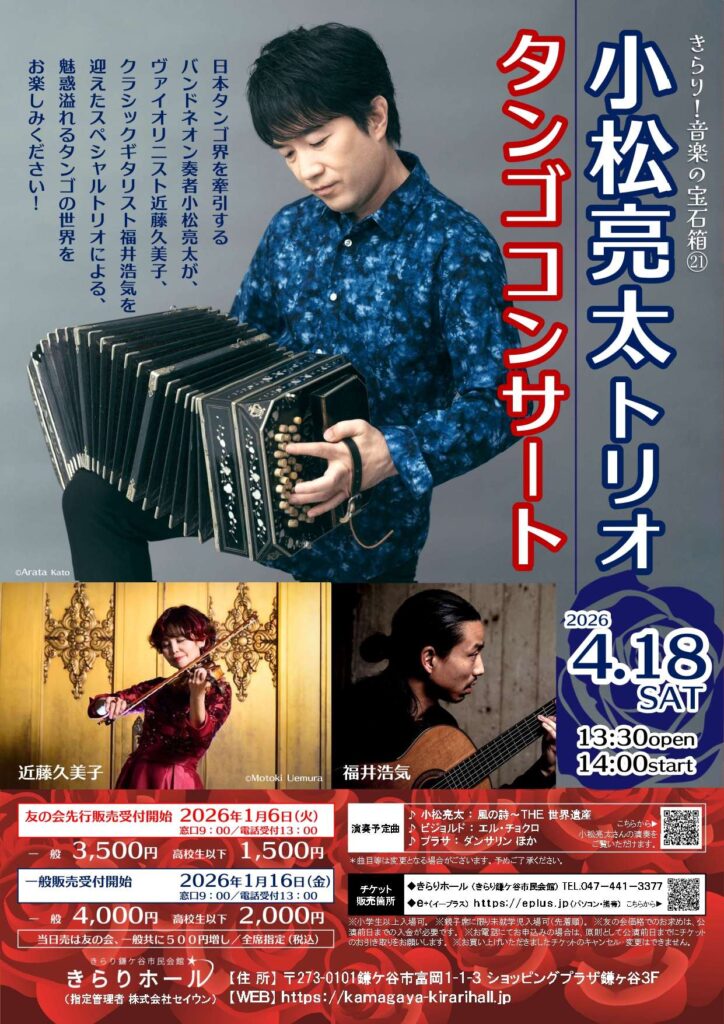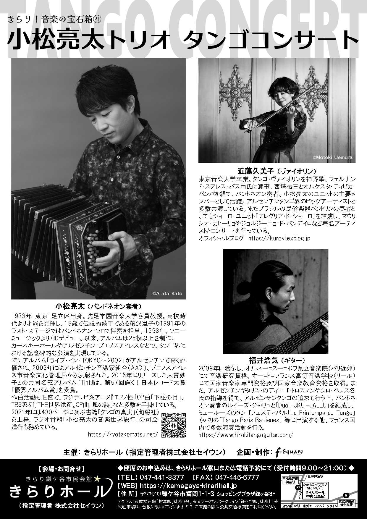 | 出演者 | 小松亮太(バンドネオン) 近藤久美子(バイオリン) 福井浩気(クラッシックギター) |